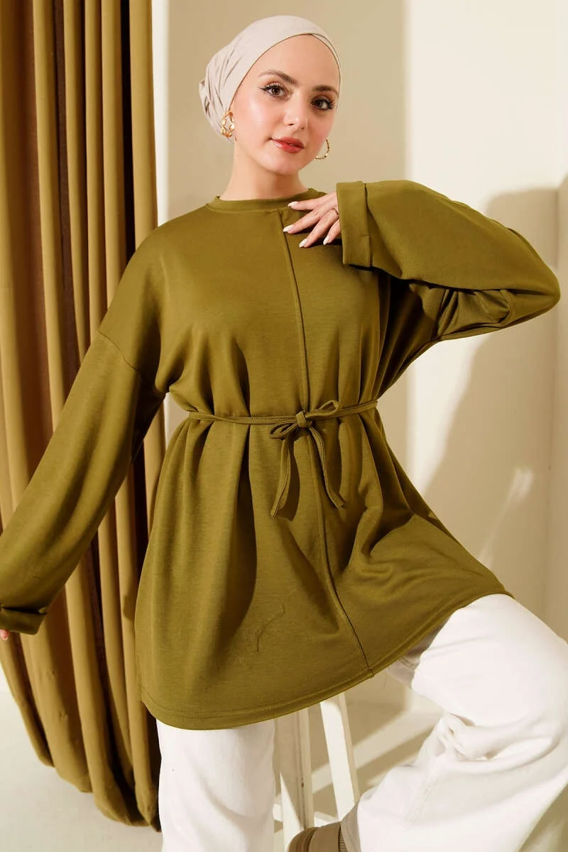 Bisiklet Yaka İp Kuşaklı Tunik Yağ Yeşil