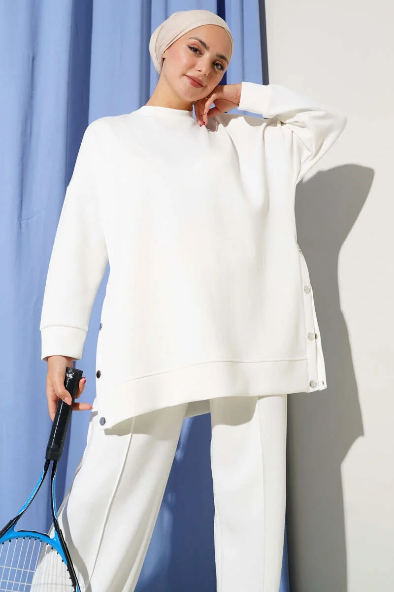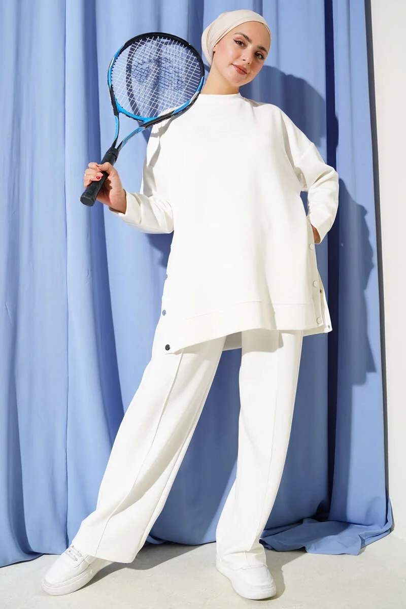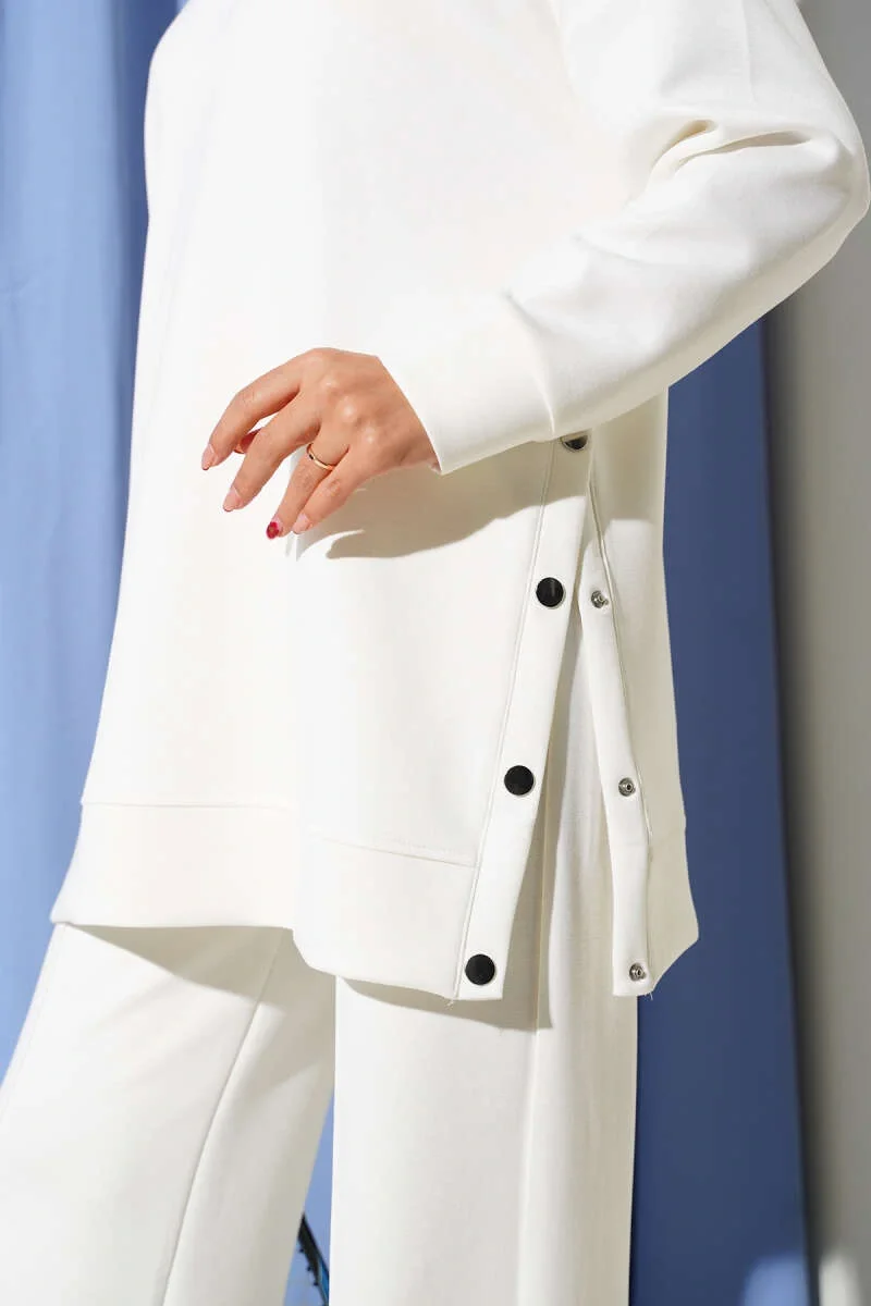 Bisiklet Yaka Yanları Metal Düğmeli İkili Takım Beyaz