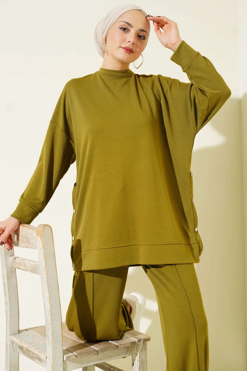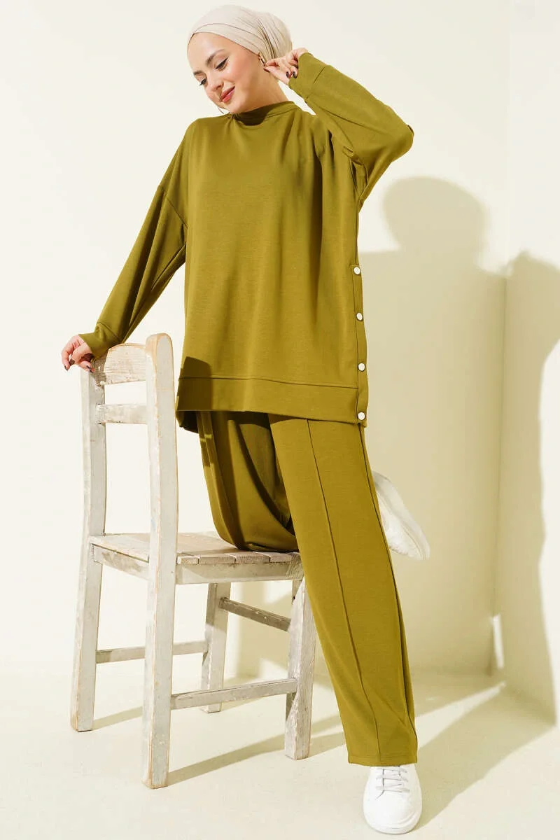 Bisiklet Yaka Yanları Metal Düğmeli İkili Takım Yağ Yeşili