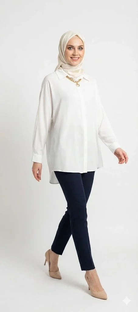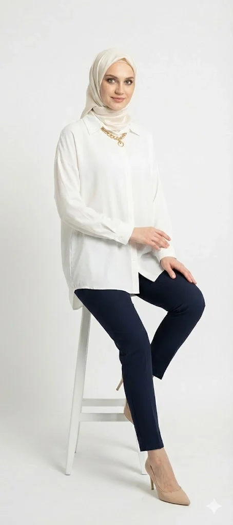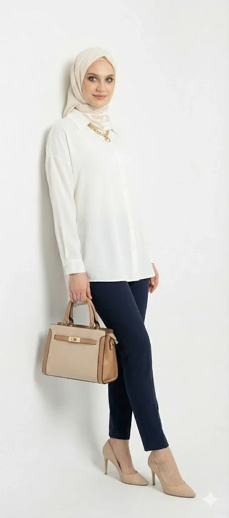 Kombin Önerileri: Görseldeki gibi lacivert dar paça bir pantolon ve ten rengi stiletto ile ofis şıklığı için idealdir. Daha günlük bir görünüm için kot pantolon ve spor ayakkabılarla kombinleyerek casual bir stil oluşturabilirsiniz. Kemik rengi ipek eşarp ile tesettür stilinizi tamamlayın.