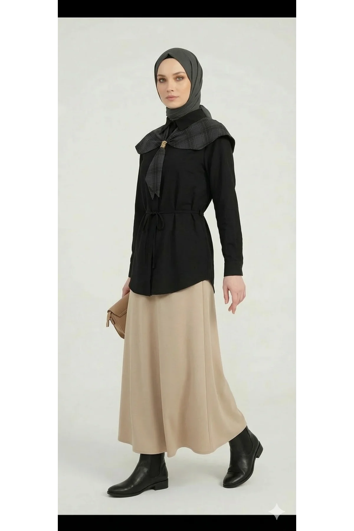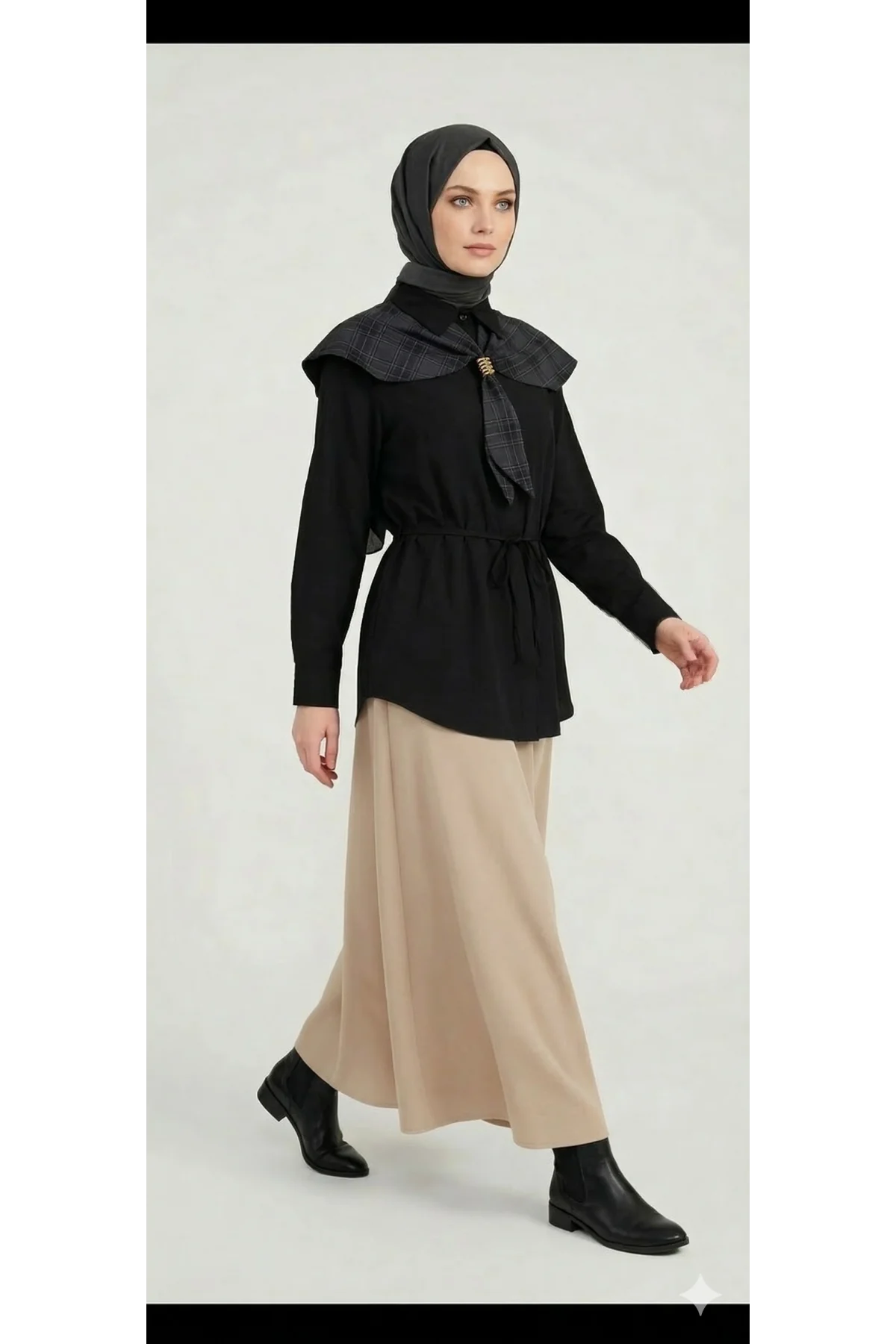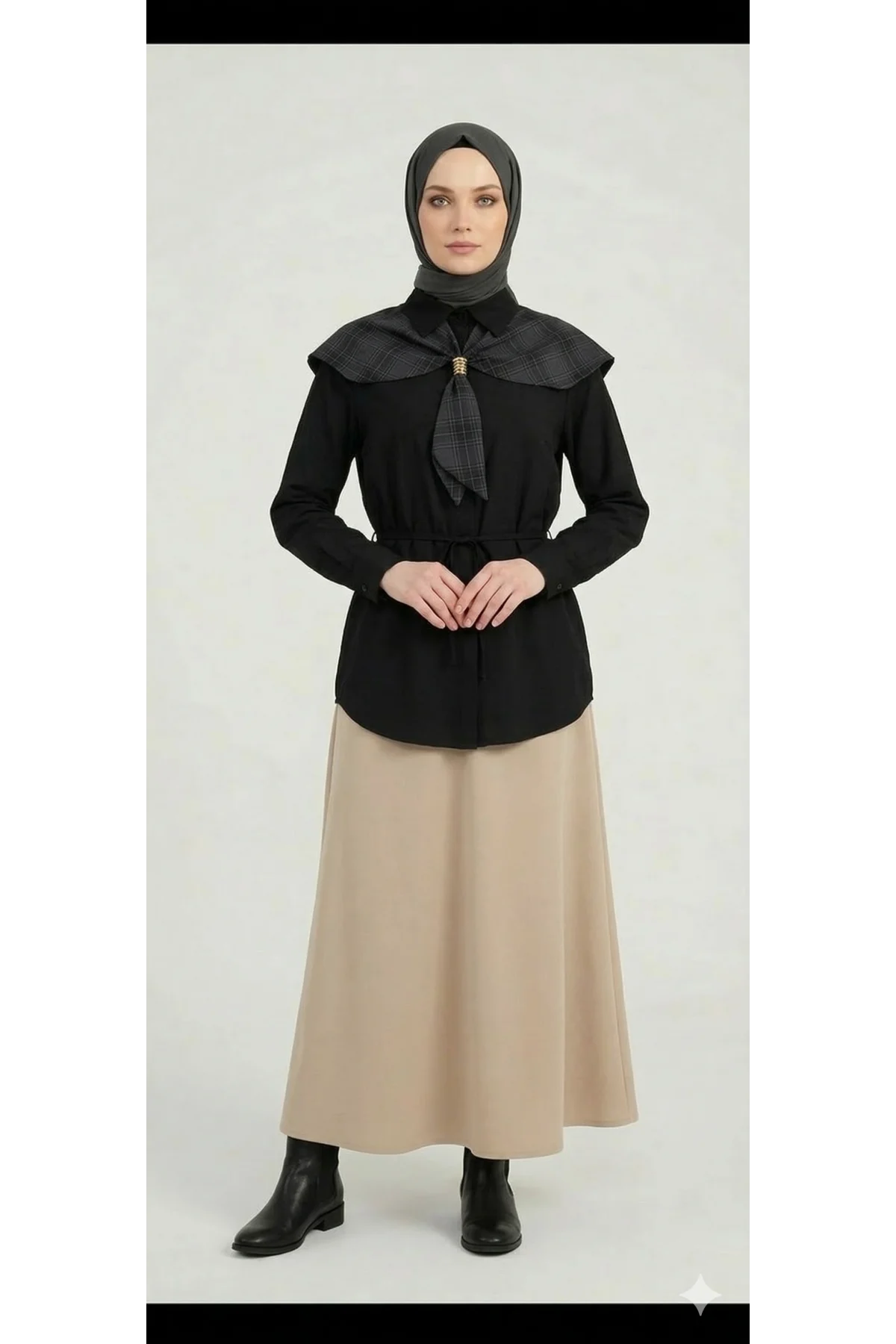 Hem ofis şıklığında hem de günlük kombinlerinizde fark yaratmak isteyenler için tasarlanan bu siyah tunik gömlek, romantik detayları modern kesimle buluşturuyor. Yumuşak dokusu ve nefes alan kumaşıyla gün boyu konfor sunarken, omuzlardaki ekose pelerin yaka detayıyla tüm bakışları üzerinize çekecek.