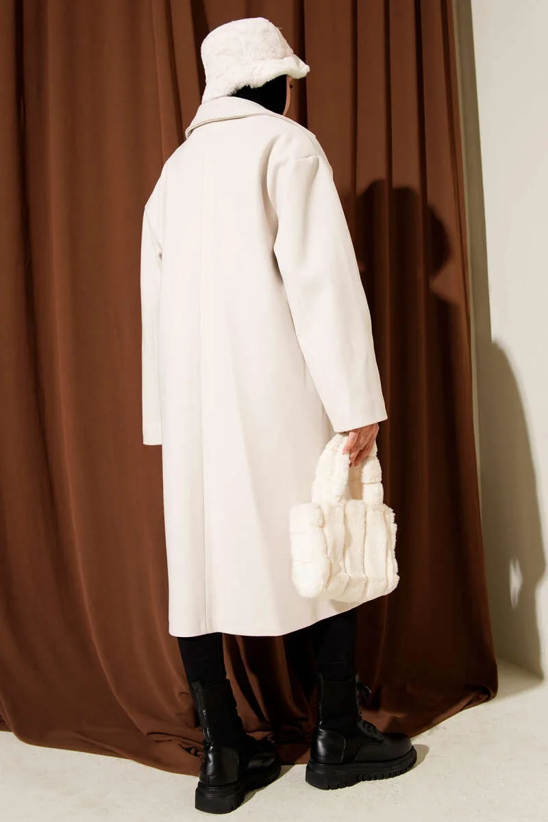 Ekru Lüks Kürk Detaylı Uzun Kaban