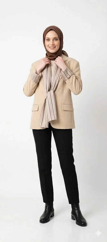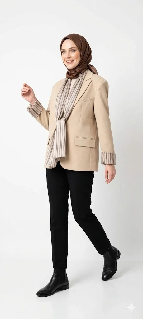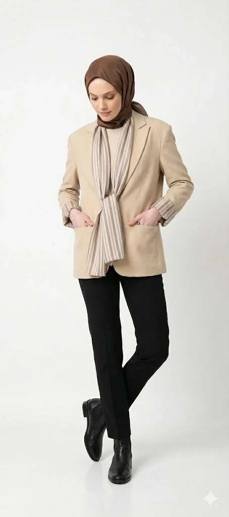 Göz Alıcı Astar Detayı: Ceketin kollarını kıvırdığınızda ortaya çıkan çizgili garni ve uyumlu fular detayı, kombinize hareket katar.