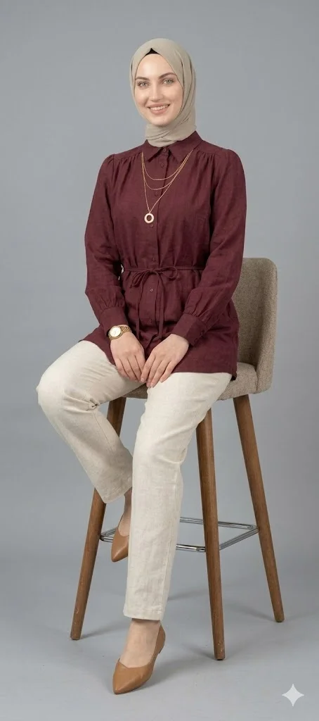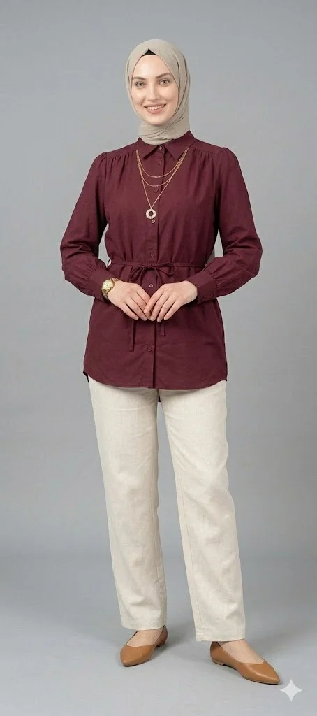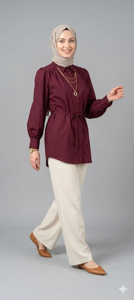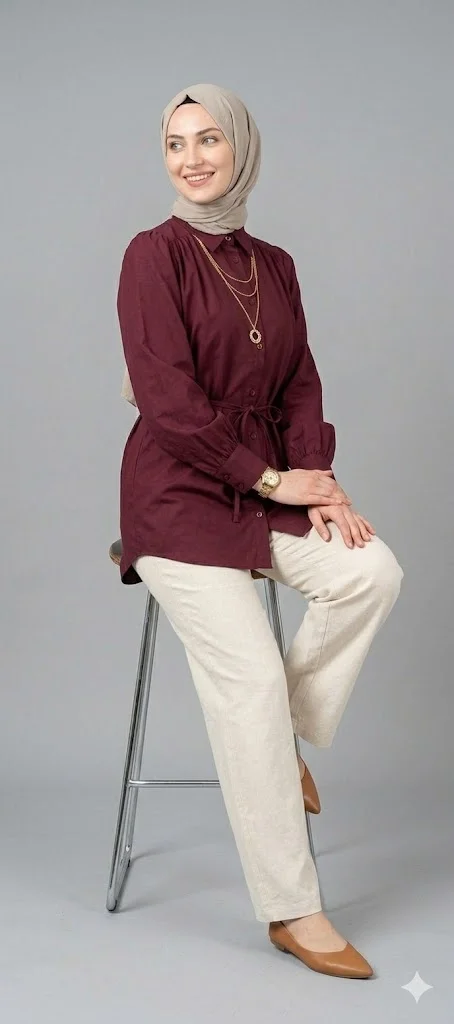 Zarif ve Rahatlığın Buluşma Noktası: Bordo Kuşaklı Gömlek Hem günlük koşturmacanızda hem de ofis şıklığınızda size eşlik edecek bu zarif bordo gömlek, gardırobunuzun favori parçalarından biri olmaya aday. Belden bağlamalı seyyar kuşağı sayesinde bedeninize kusursuz uyum sağlarken, zarif bir silüet yaratır. Omuzlardaki hafif büzgü detayları ve klasik gömlek yakası ile modern bir duruş sergiler.