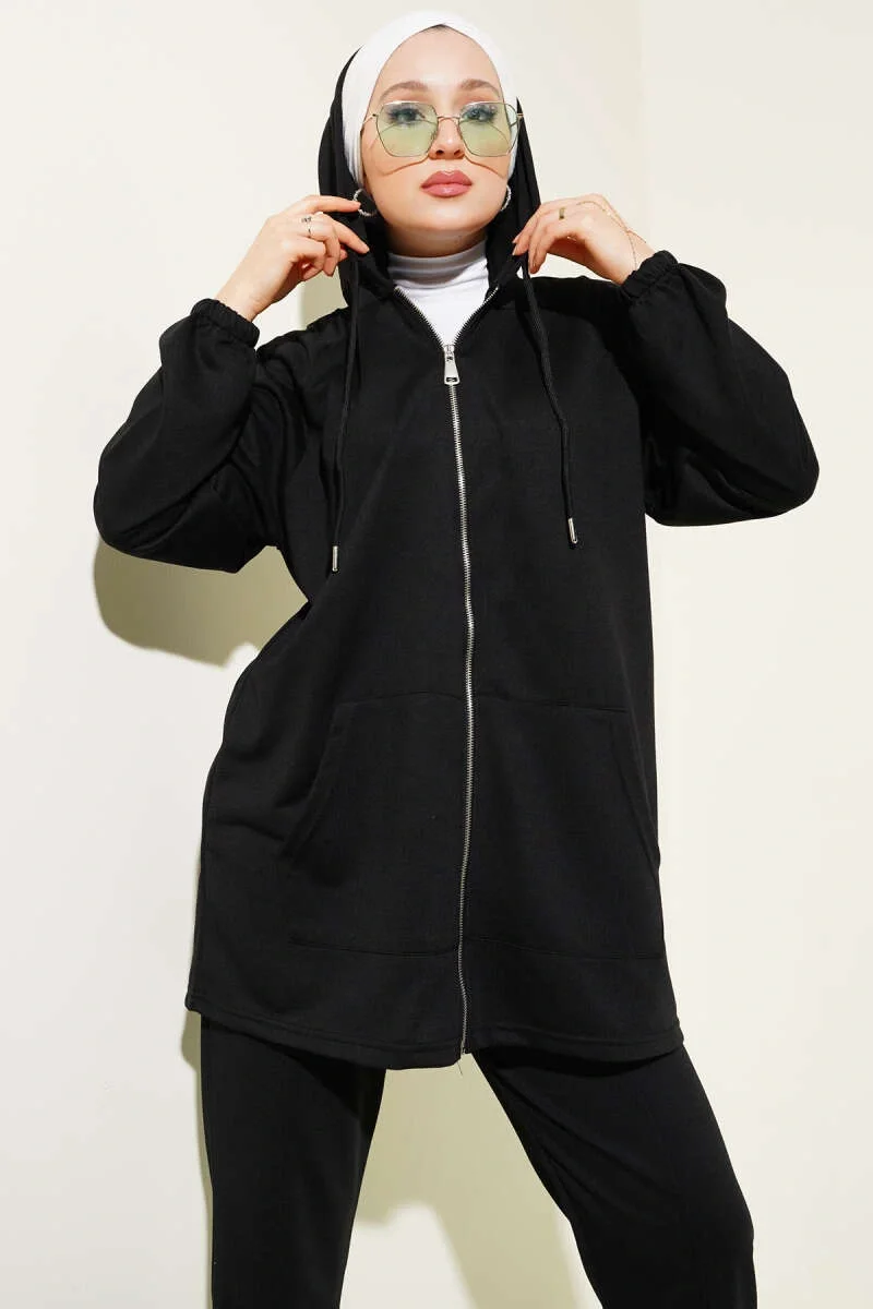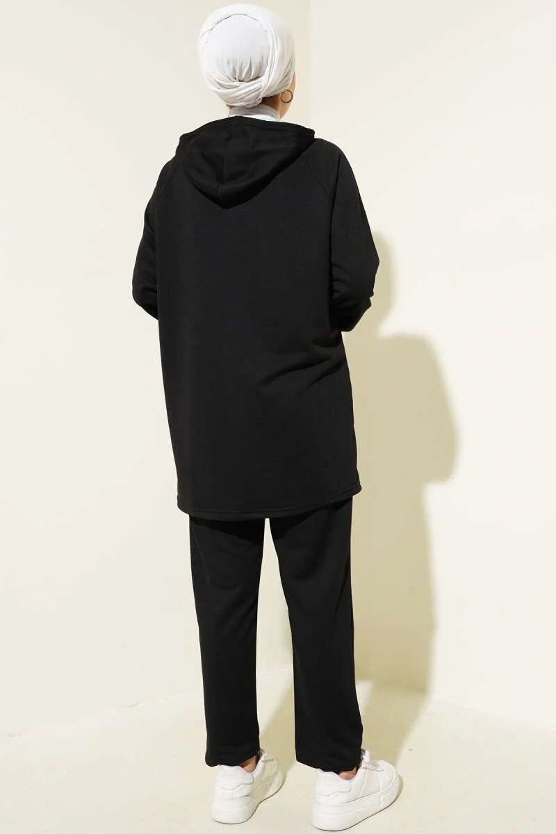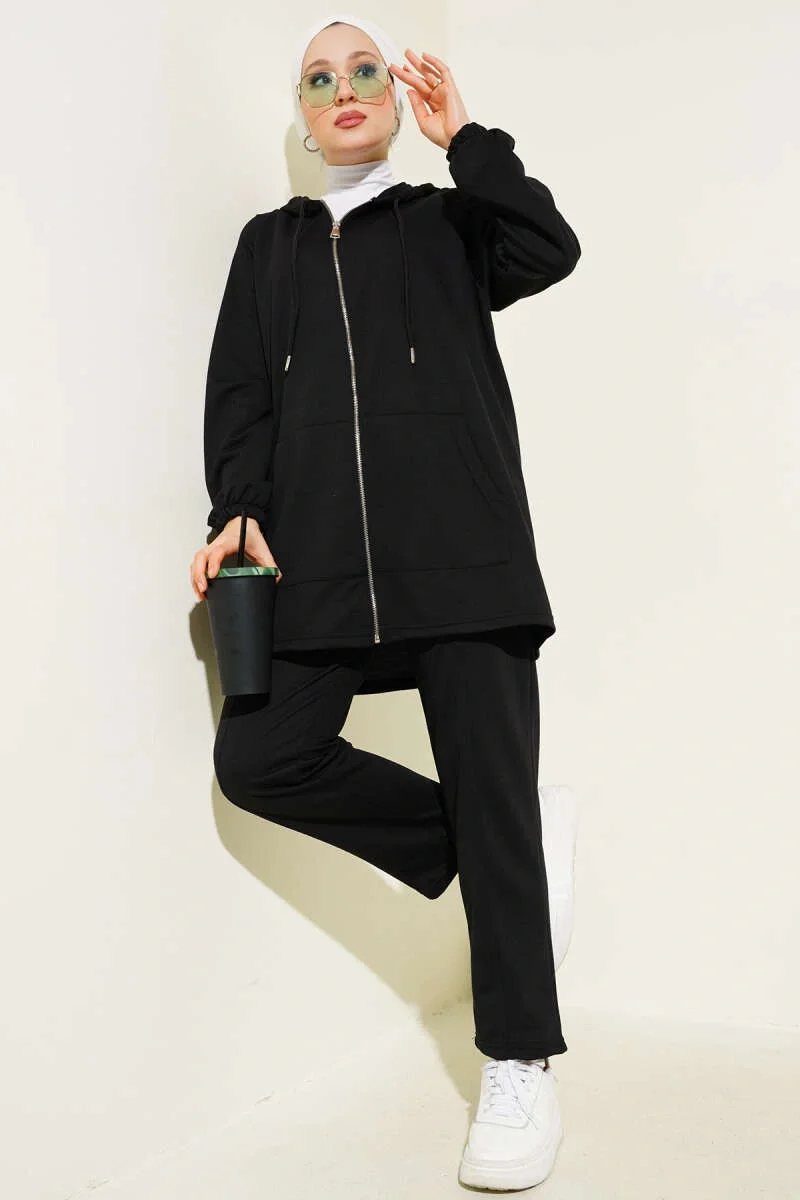 Kanguru Cepli Fermuarlı İkili Takım Siyah