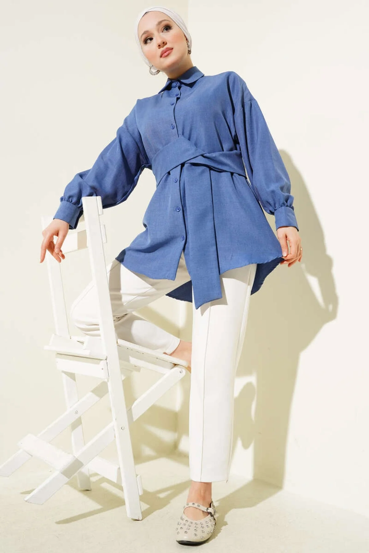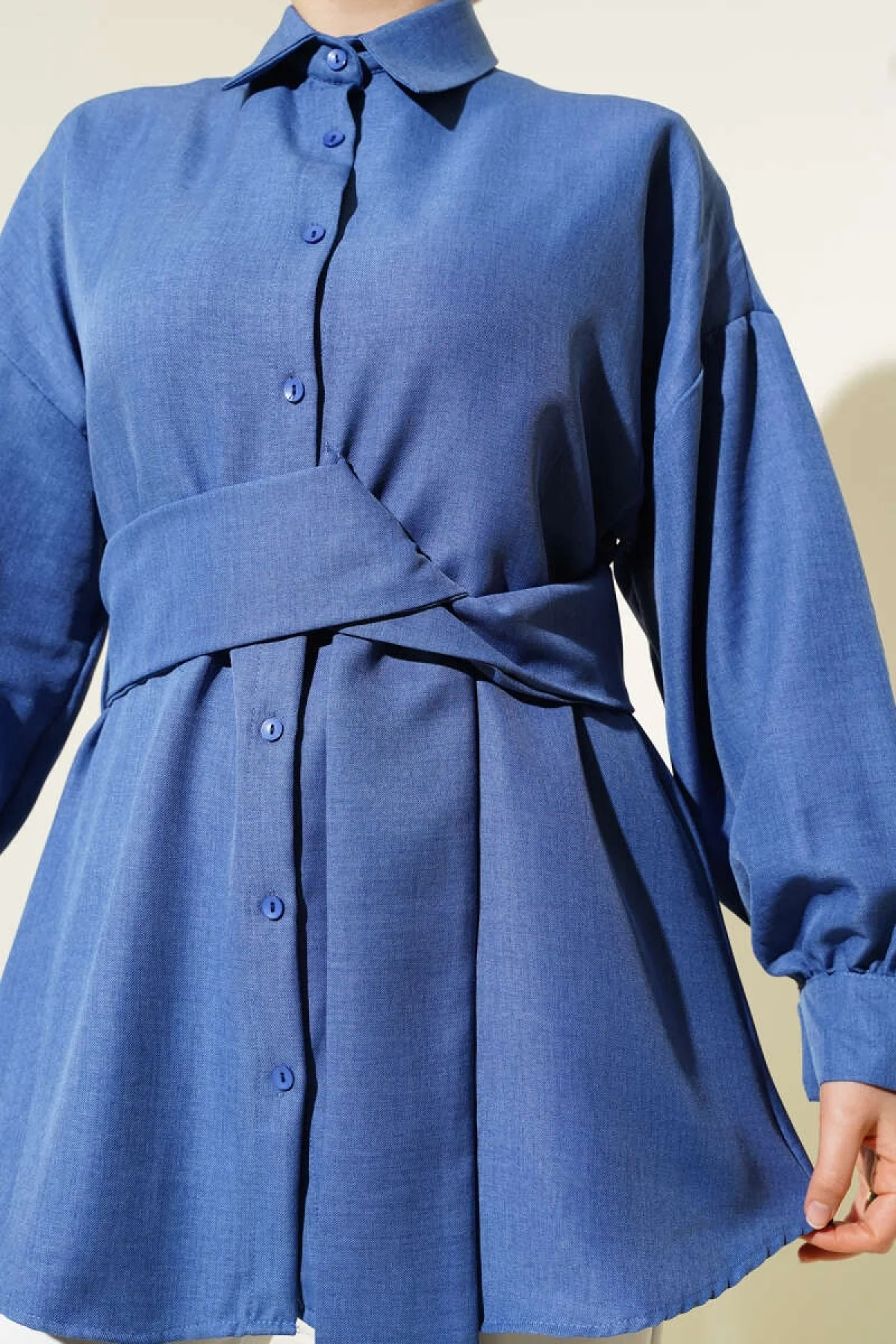 Kendinden Geniş Kuşaklı Gömlek İndigo