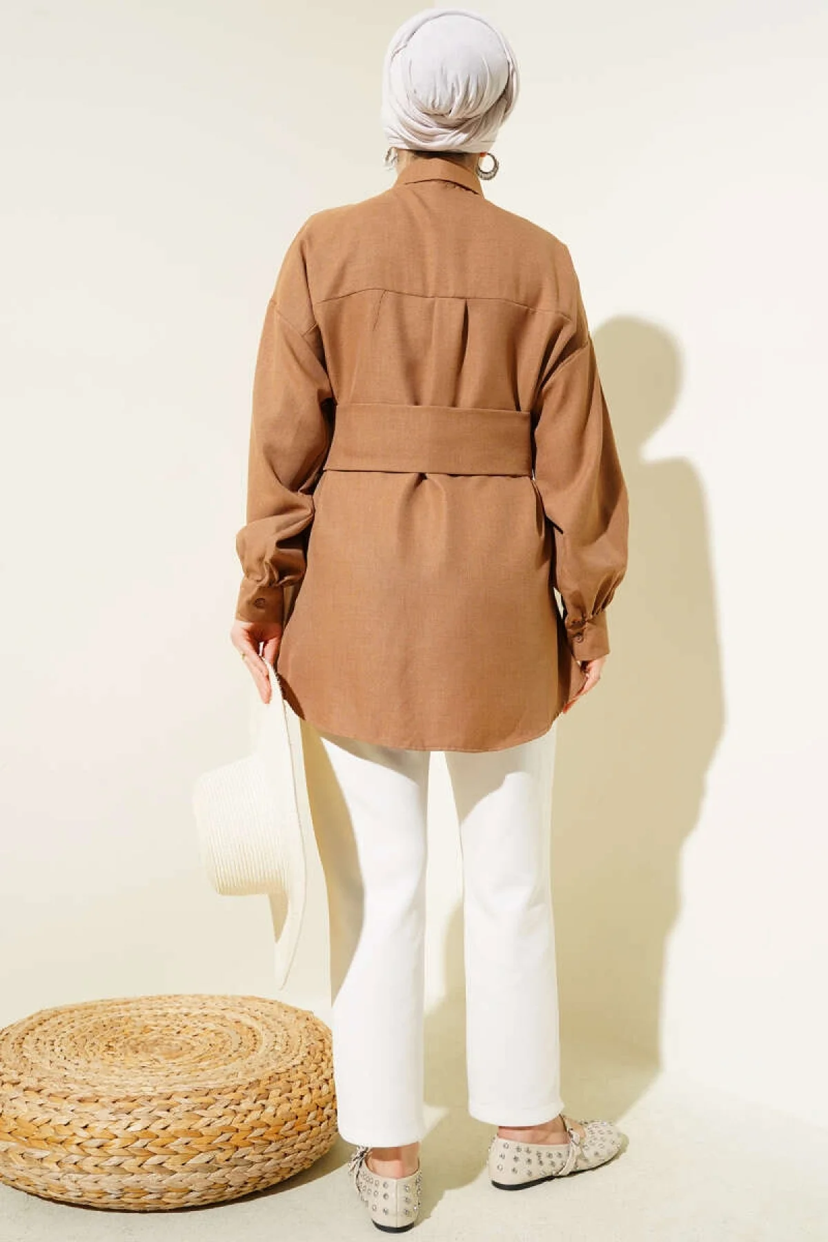 Yazgı Moda Kadın Ekru Hakim Yaka Kuşaklı Tesettür Gömlek