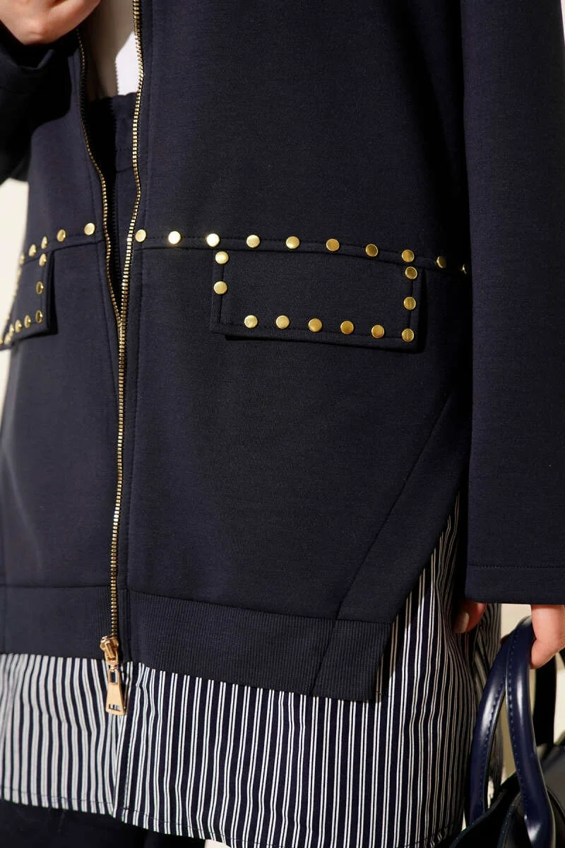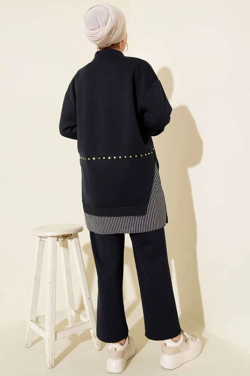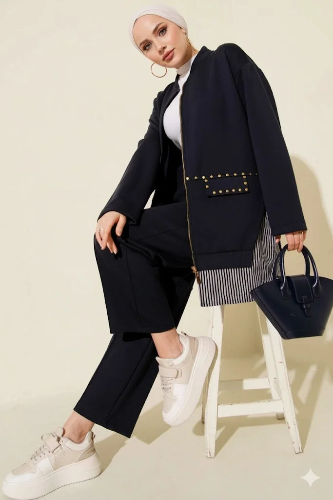 Tasarım Detayları: Biyeli şerit geçişleri ve metalik zımba aksesuarları ile zenginleştirilmiş tasarım.