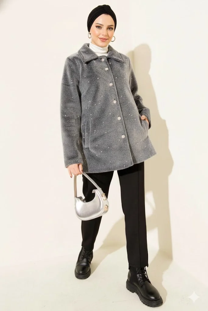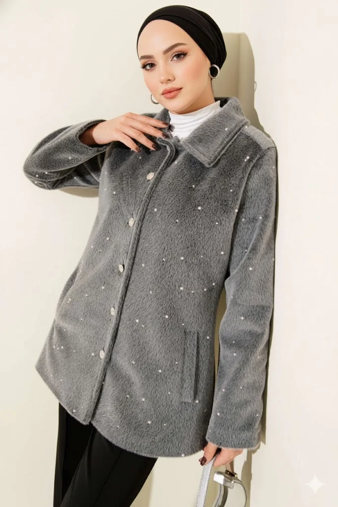 Gri Lüks Tay Tüyü İnci İşlemeli Kaban