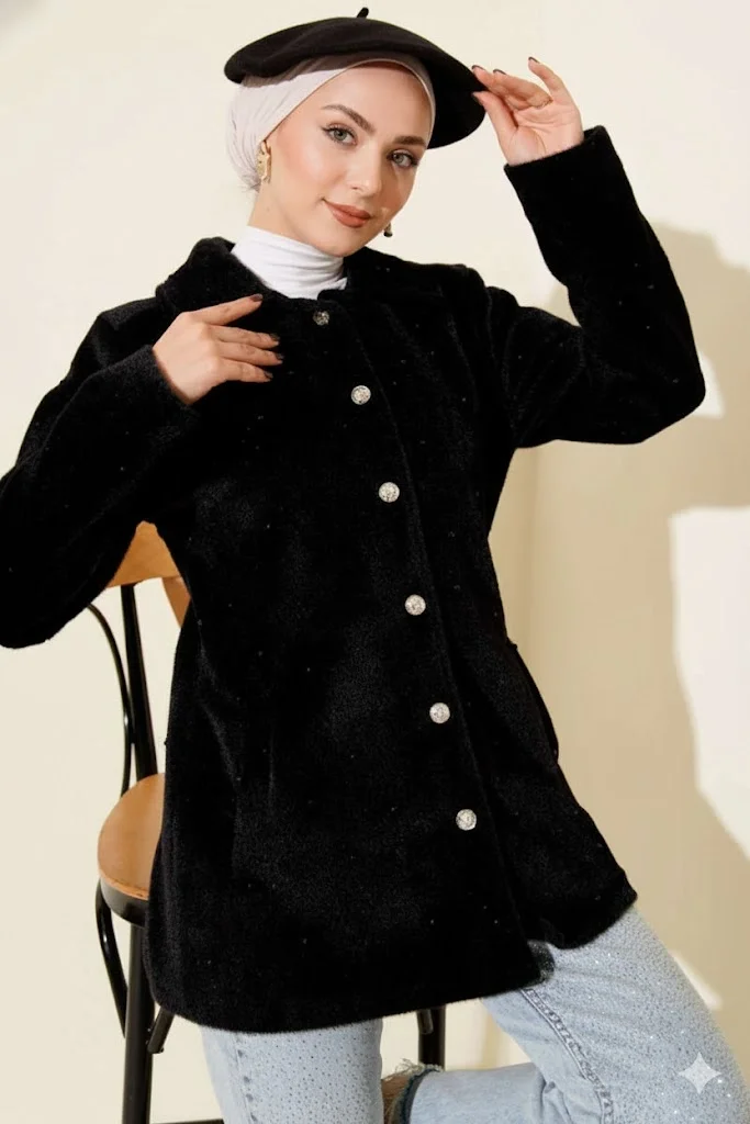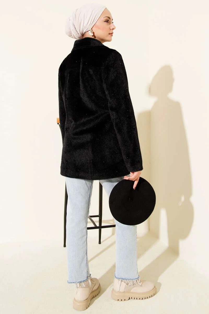 Siyah Lüks Tay Tüyü İnci İşlemeli Kaban