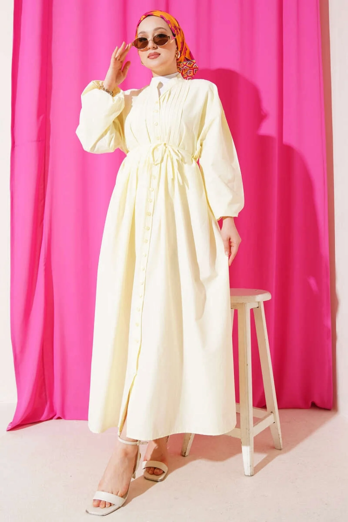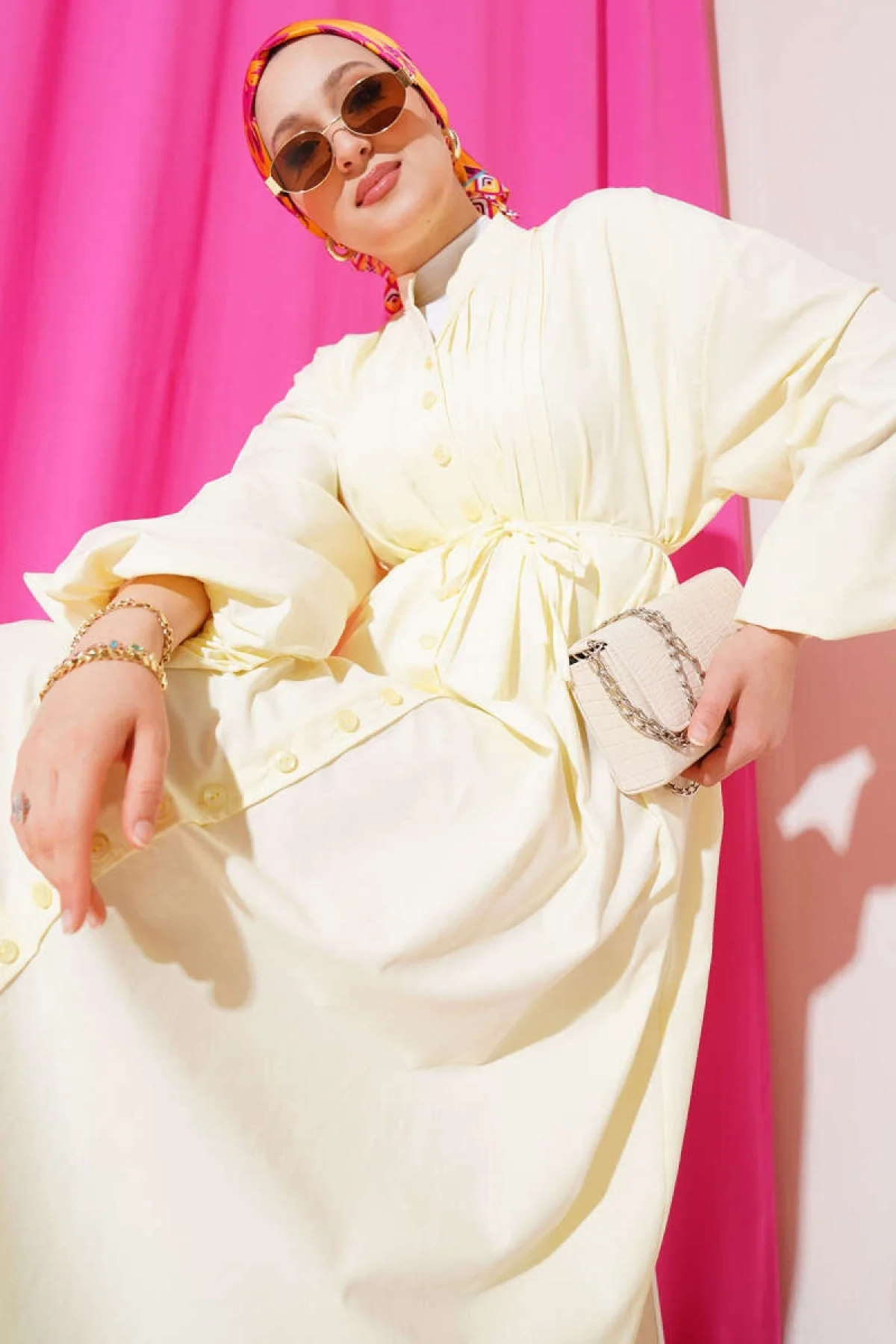 Önü Nervürlü İp Kuşaklı Elbise Lime