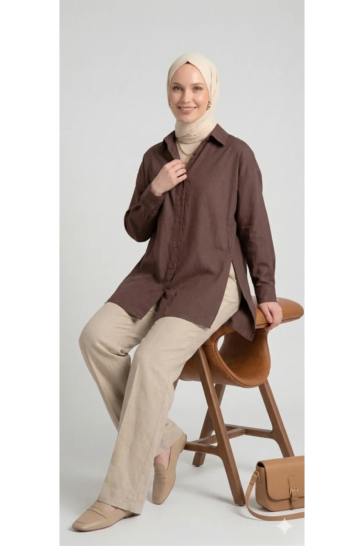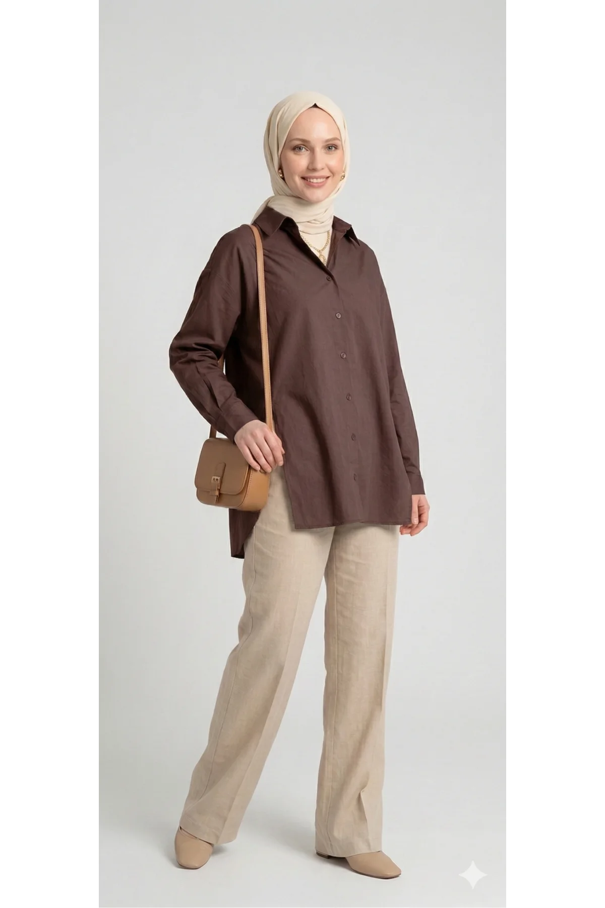 Gardırobunuzun en joker parçası olmaya aday bu özel tasarım gömlek, kaliteli çadır kumaş yapısı ve zamansız Kahve rengiyle tarzınızı bir adım öne çıkarıyor. Hem günlük kombinlerinizde hem de özel anlarınızda size eşlik edecek bu parça, tesettür modasına uygun formuyla da dikkat çekiyor.