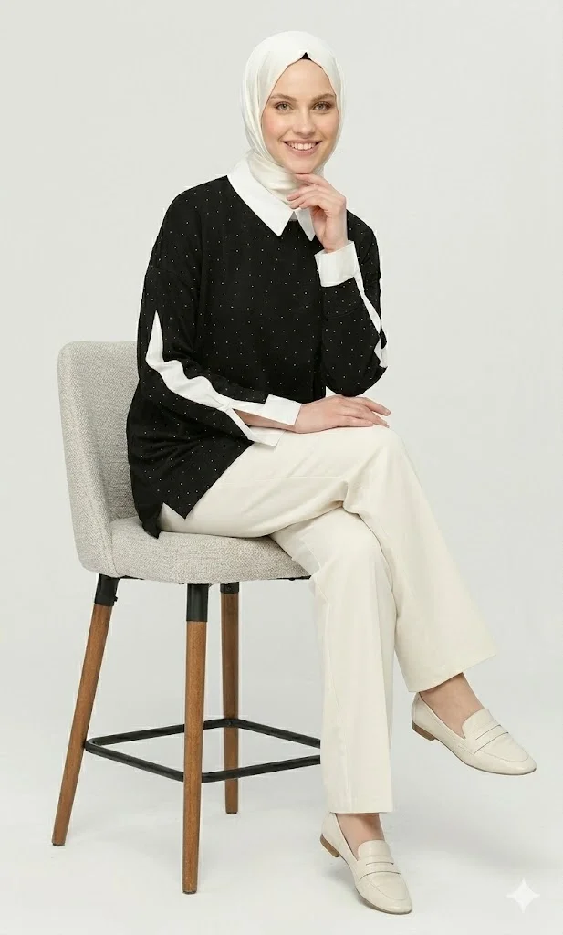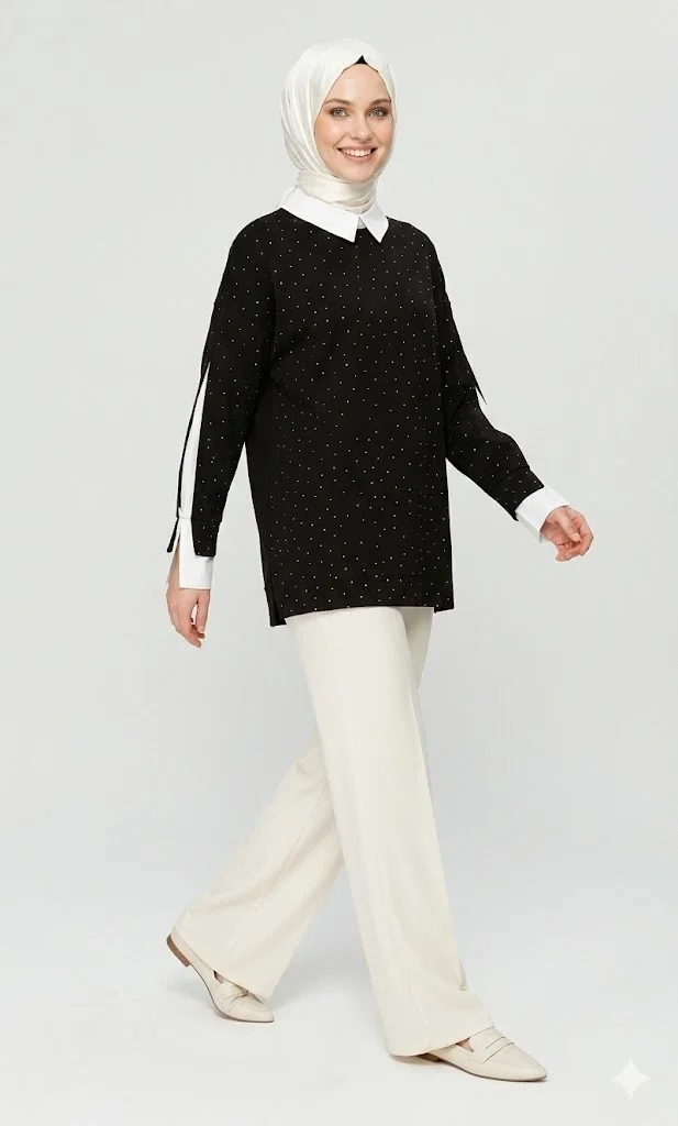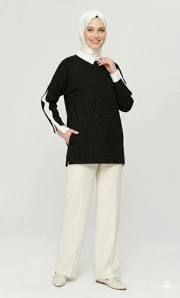 Gardırobunuzun en şık ve kurtarıcı parçası olmaya aday bu tunik, modern tesettür giyim anlayışıyla hem konforu hem de estetiği birleştiriyor. Tasarımındaki beyaz gömlek yakası ve kol ucu detayları sayesinde, ekstra bir gömlek giymeye gerek kalmadan kusursuz bir "iki parçalı" (fake layering) görünüm sunar.